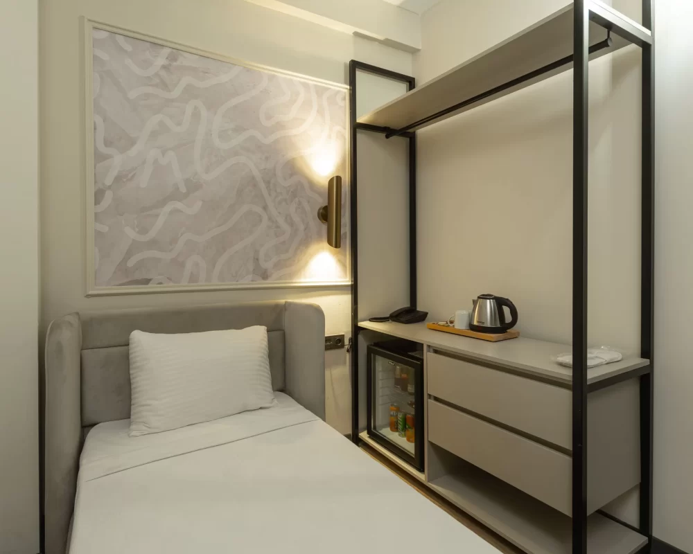 7 m²’lik kompakt odada yer alan single yatak, tek başına seyahat edenler için ideal uyku alanı sağlar. Klima, LCD televizyon ve ücretsiz Wi-Fi gibi modern olanaklar, konaklamanızı kolaylaştırır. Mini buzdolabı ve gardırop ise kişisel eşyalarınızı düzenli şekilde saklamanıza imkan tanır.