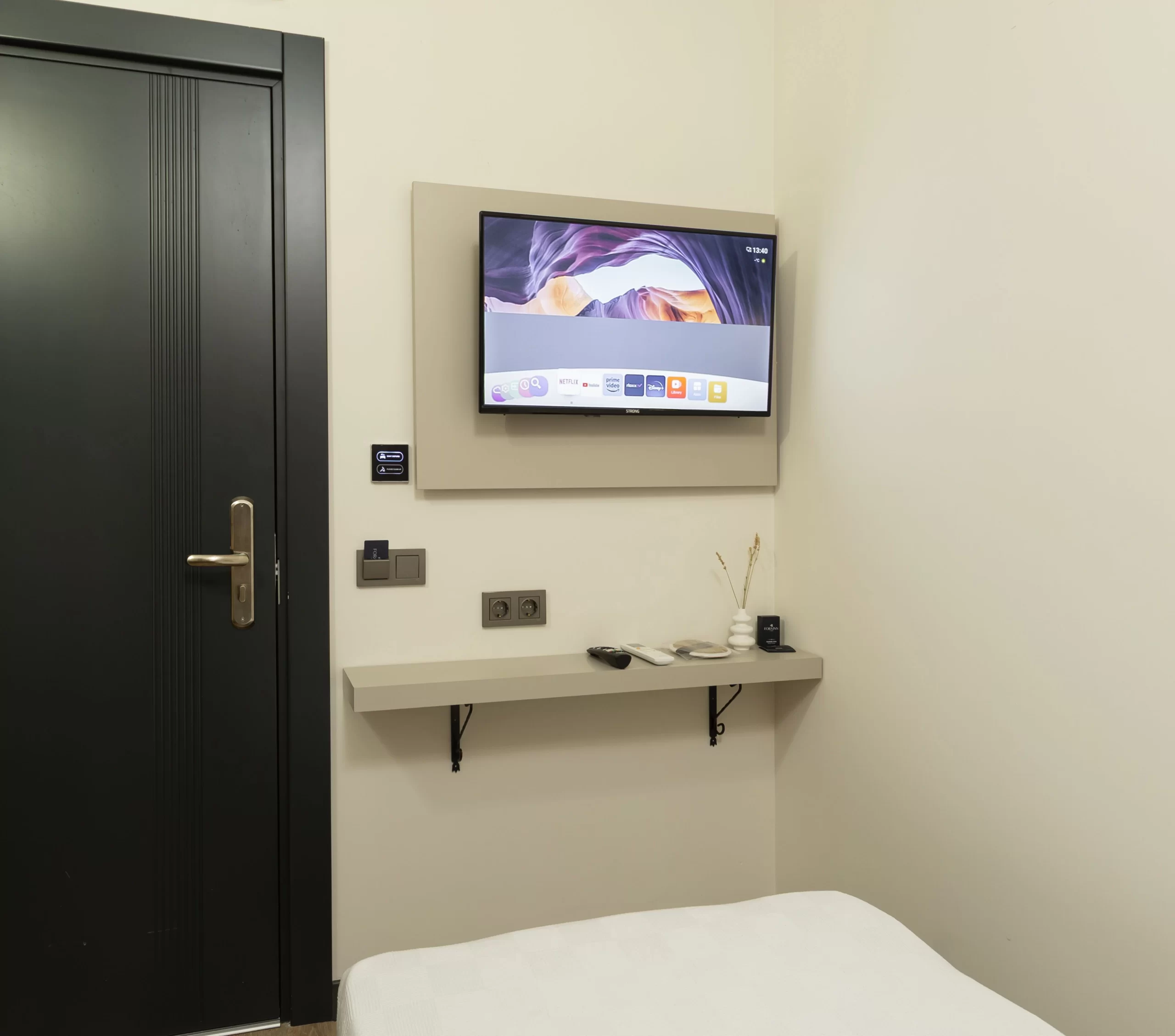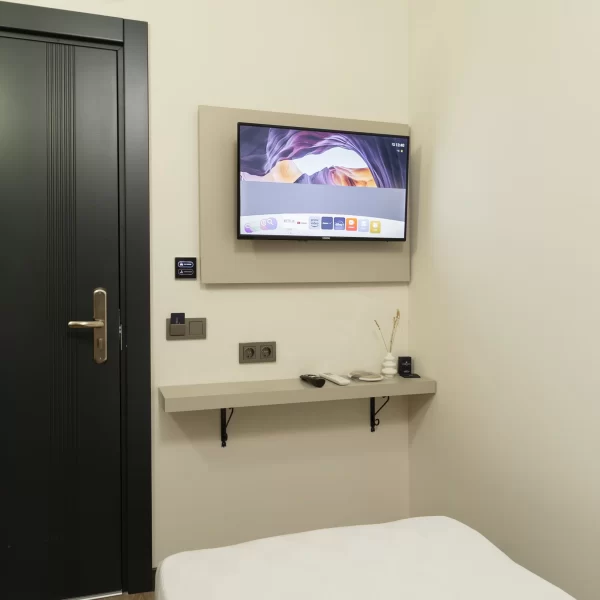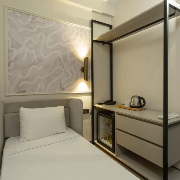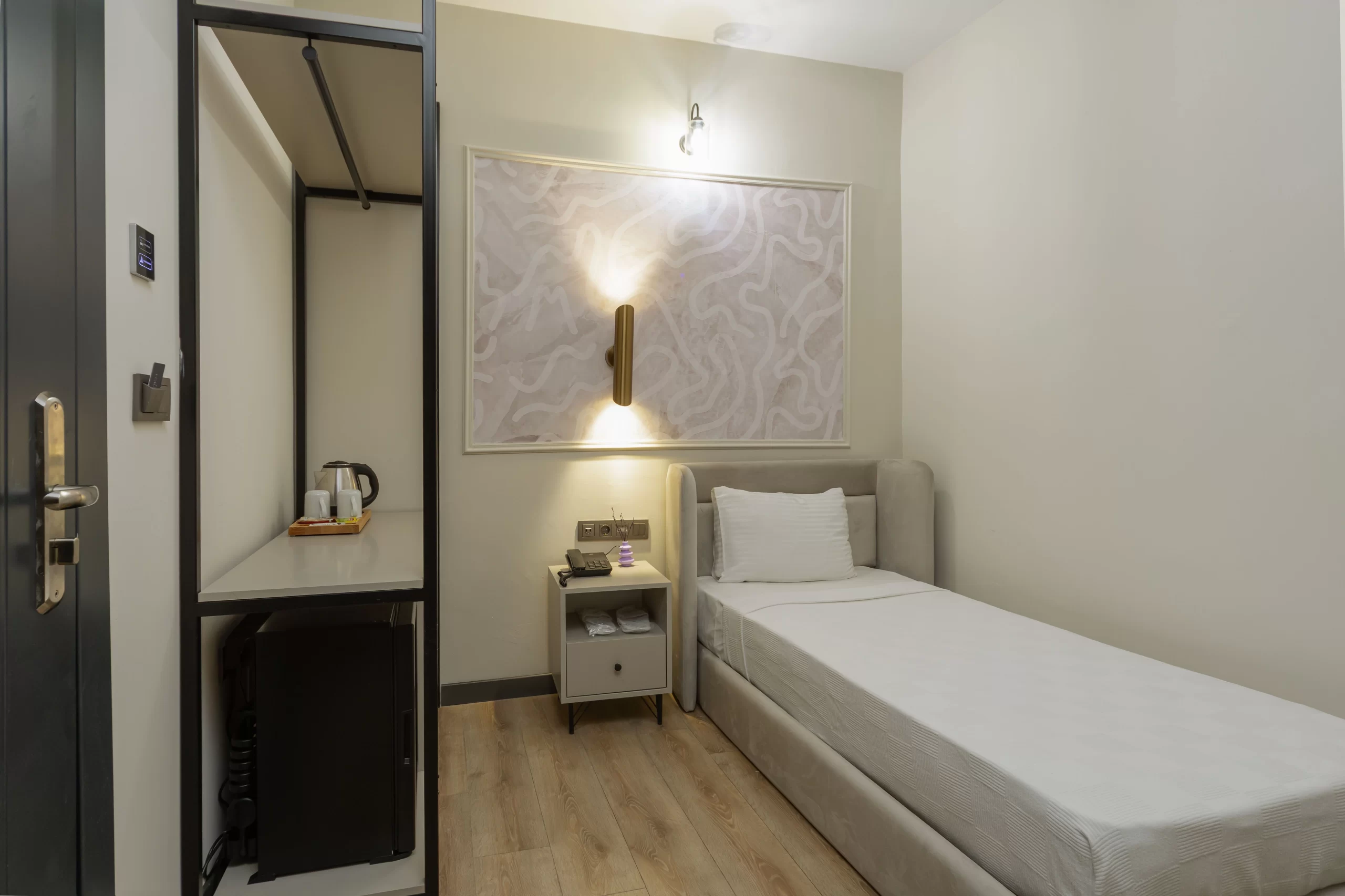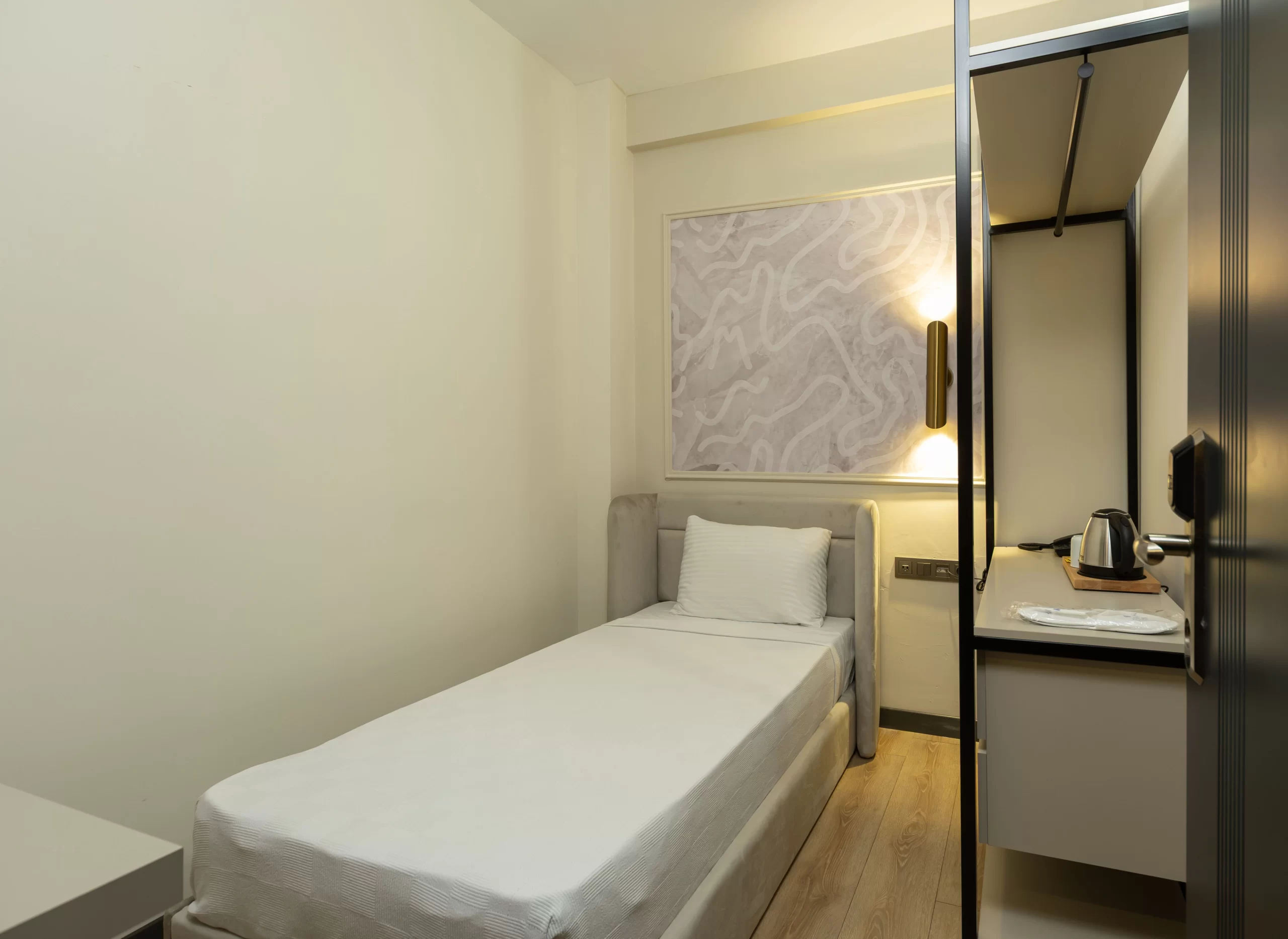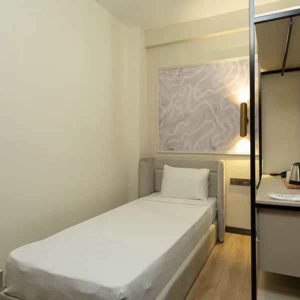 7 m²’lik kompakt odada yer alan single yatak, tek başına seyahat edenler için ideal uyku alanı sağlar. Klima, LCD televizyon ve ücretsiz Wi-Fi gibi modern olanaklar, konaklamanızı kolaylaştırır. Mini buzdolabı ve gardırop ise kişisel eşyalarınızı düzenli şekilde saklamanıza imkan tanır.