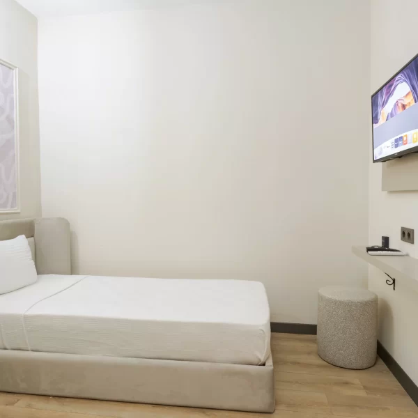 FORA INN LARA’nın kompakt ve bütçe dostu seçeneklerinden biri olan Eco Single Odamız, 7 m² alanıyla tek kişilik konaklamalar için tasarlanmıştır. Odada bulunan 1 adet single yatak, tek başına seyahat eden misafirlerimiz için rahat ve fonksiyonel bir yaşam alanı sunar.