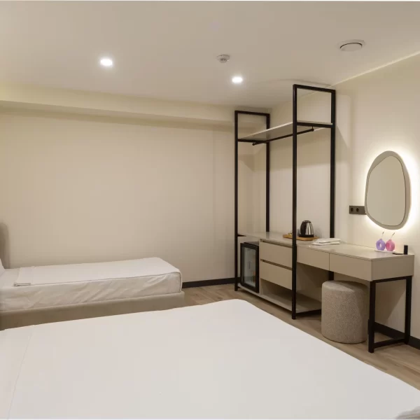 Deluxe Odamız, özellikle kısa süreli tatil planları yapan çiftler, iş seyahati konukları ya da sade ve düzenli bir konaklama arayanlar için idealdir. Odanın kompakt ama fonksiyonel yapısı, hem gündüzleri dinamik bir gün geçirmenize hem de geceleri huzurlu bir şekilde dinlenmenize olanak tanır. Kalabalıktan uzak, sessiz ve sakin bir konaklama için tercih edebileceğiniz bu oda, konforun ve sadeliğin kusursuz dengesini sunar.