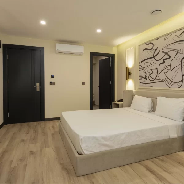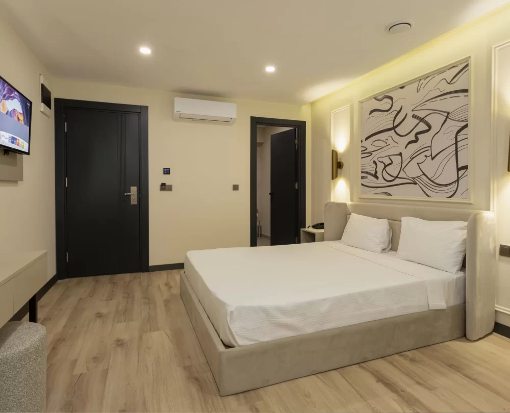 Her detayda konforu hissedeceğiniz, yalın şıklığı ve sıcak atmosferiyle sizi evinizdeymiş gibi hissettirecek bu oda, tatilinizin en güzel anılarına ev sahipliği yapmaya hazır. Akdeniz’in ruhunu yansıtan bu özel ortamda, dinlenmek, yenilenmek ve kendinize zaman ayırmak için ideal bir konaklama alternatifi sunuyoruz.