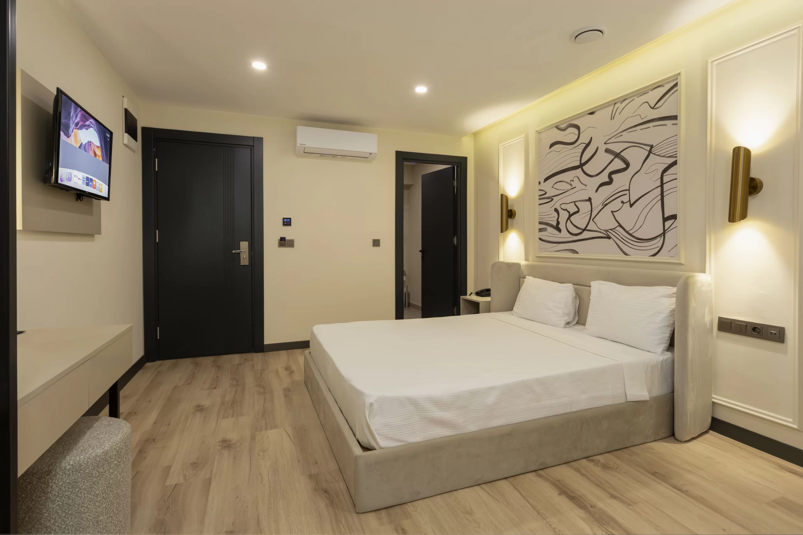 Modern tasarımı, yalın şıklığı ve fonksiyonel kullanım alanı ile öne çıkan Deluxe Odamız, 17,5 m² genişliğe sahiptir ve 2 kişilik konaklamalar için idealdir. Odada yer alan 1 adet konforlu double yatak, dinlendirici bir uyku deneyimi sunar.