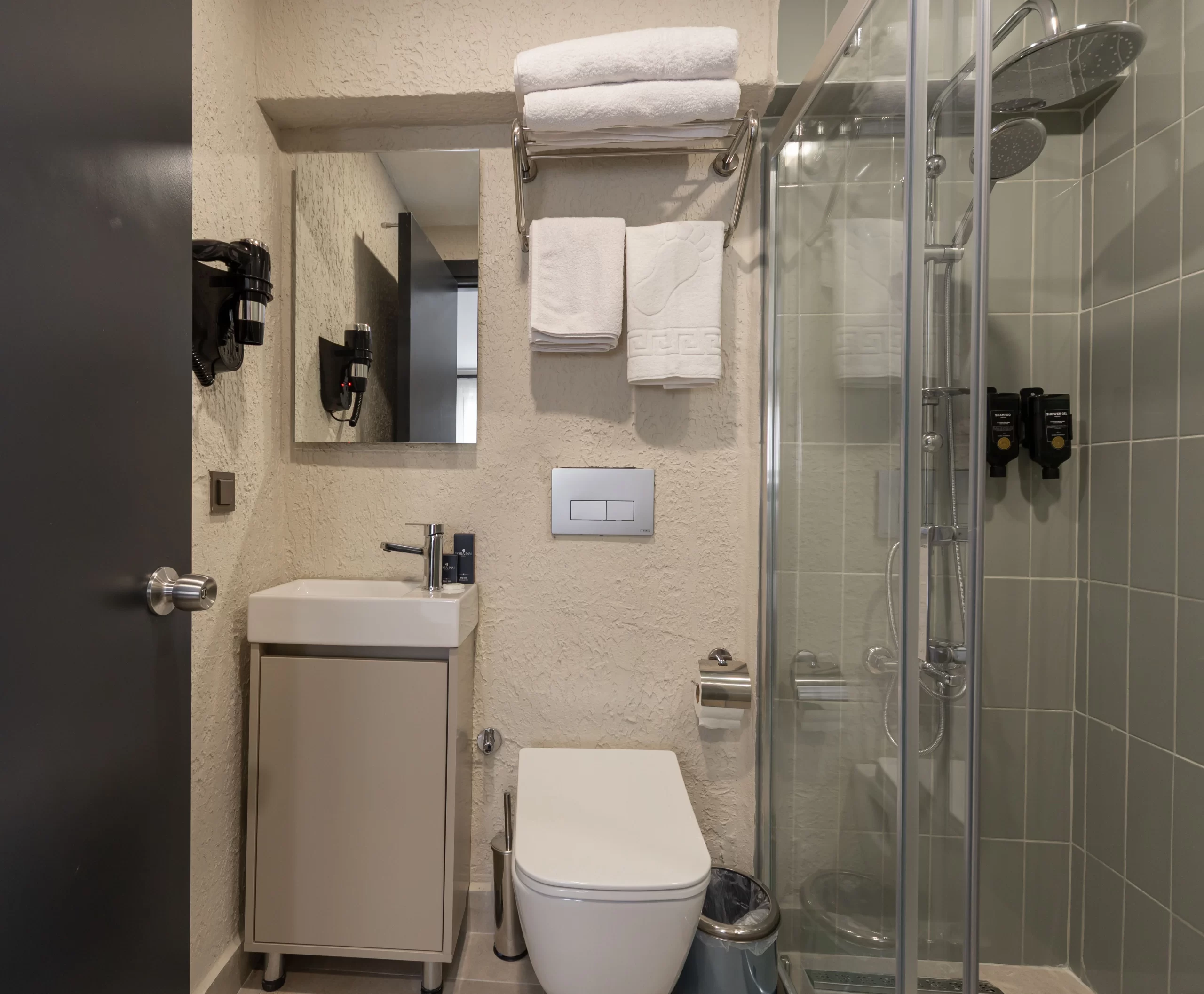 Shower, Towel Set, and Bathroom Amenities