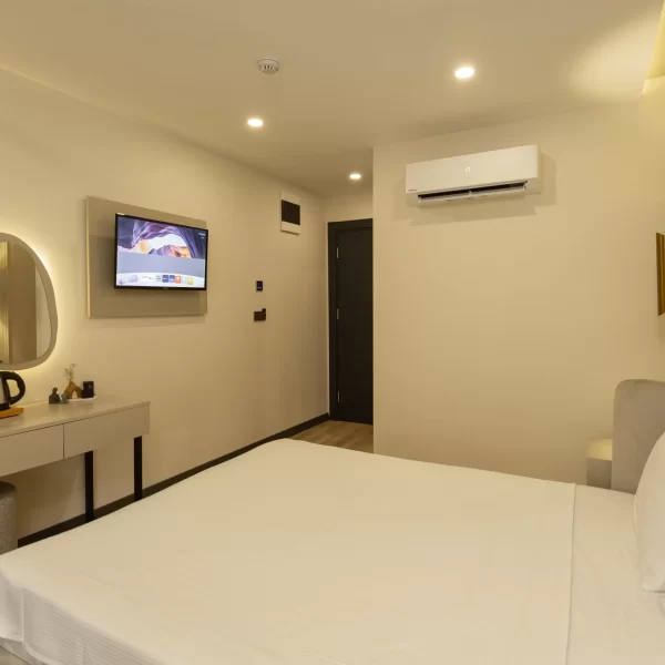 The double bed provides a comfortable sleeping and resting experience. The room is equipped with modern amenities such as air conditioning, an LCD TV, and free Wi-Fi. A mini refrigerator and wardrobe allow you to conveniently store your essentials throughout your stay.