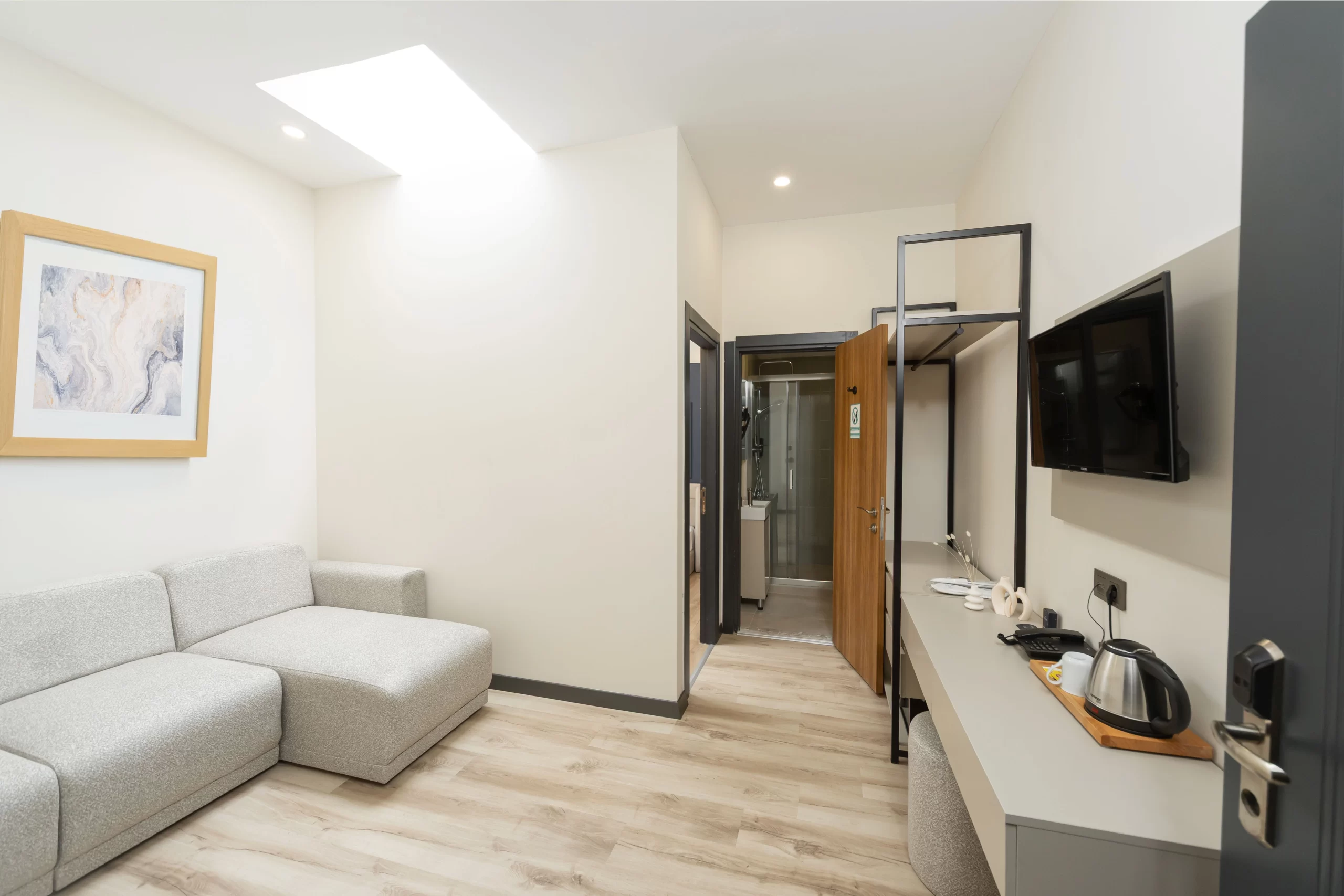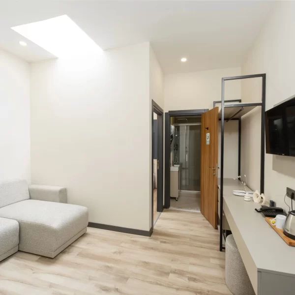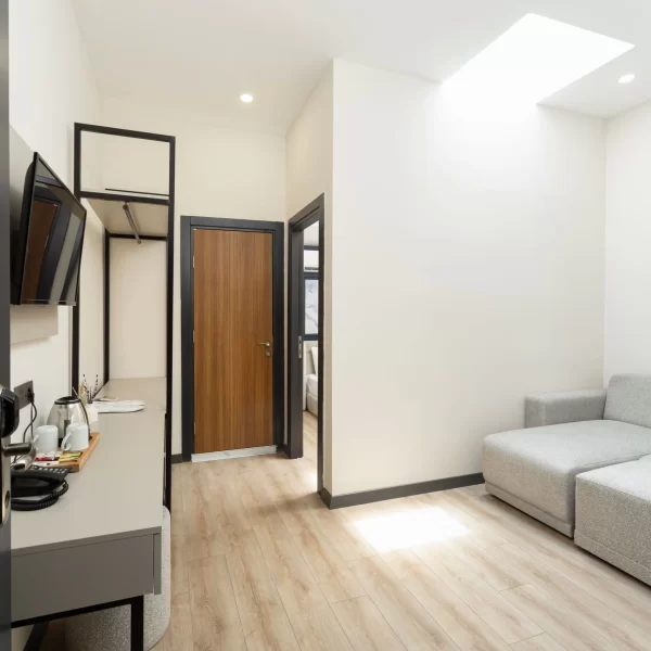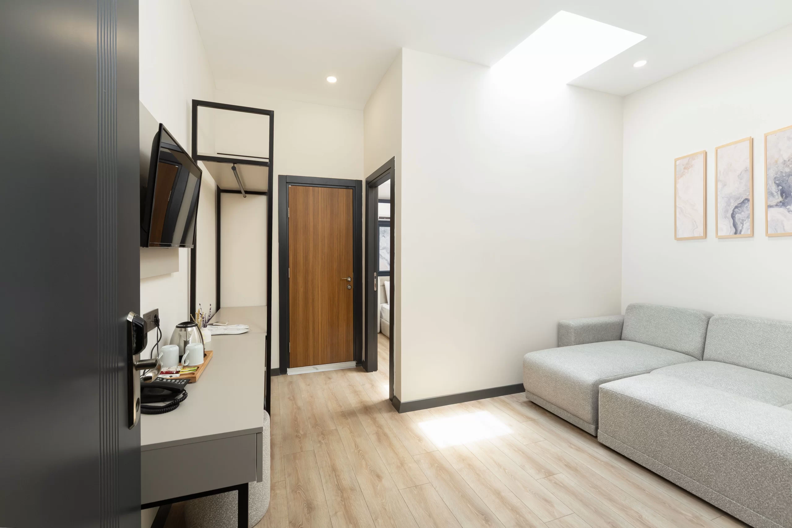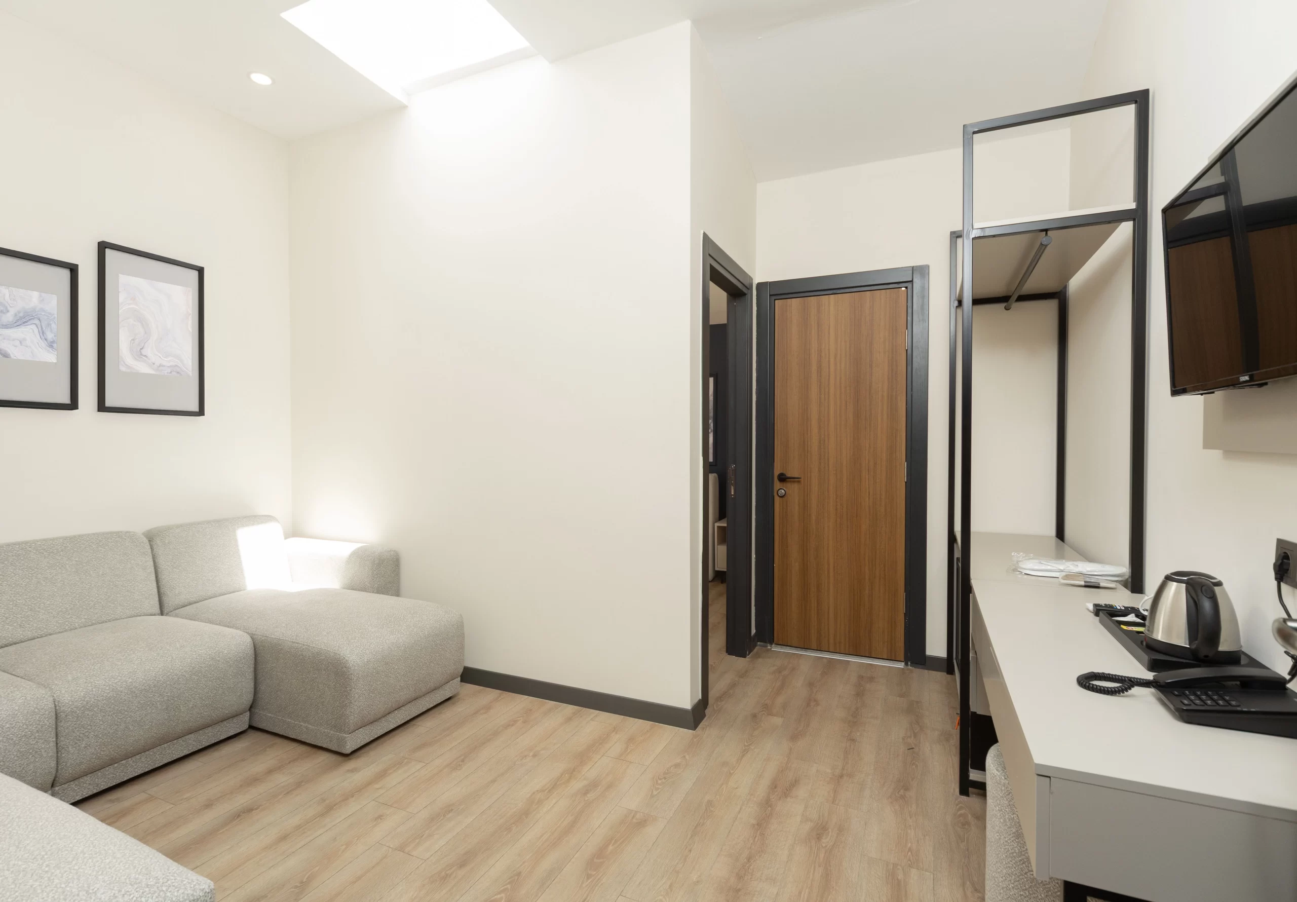With its stylish and modern décor, our Suite Room combines comfort and aesthetics to provide a premium accommodation experience. Thanks to its generous layout, you can easily organize your belongings and enjoy peaceful moments in a bright and airy living space.